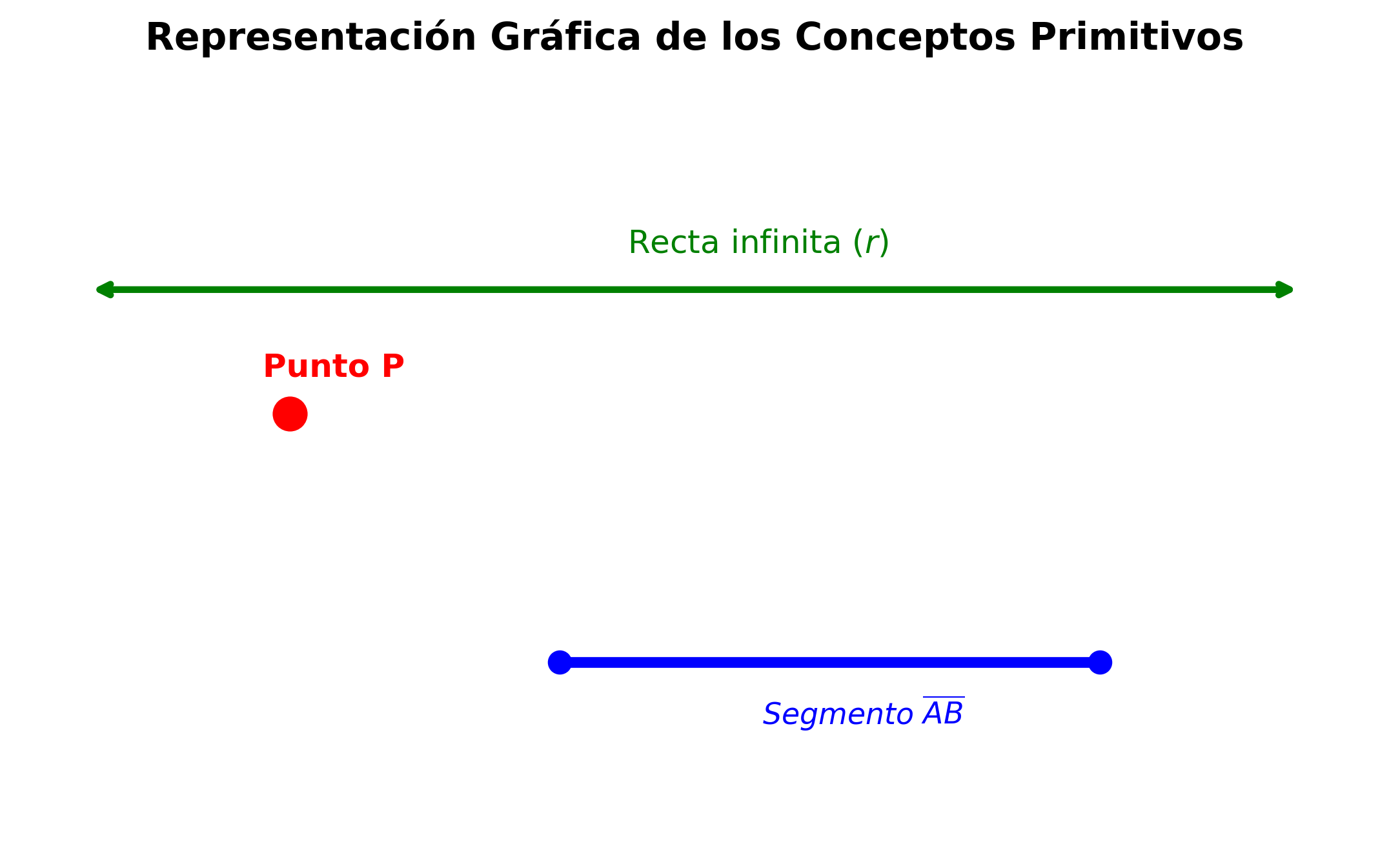 una recta (con flechas en los extremos), un segmento (con puntos finales) y un punto aislado.